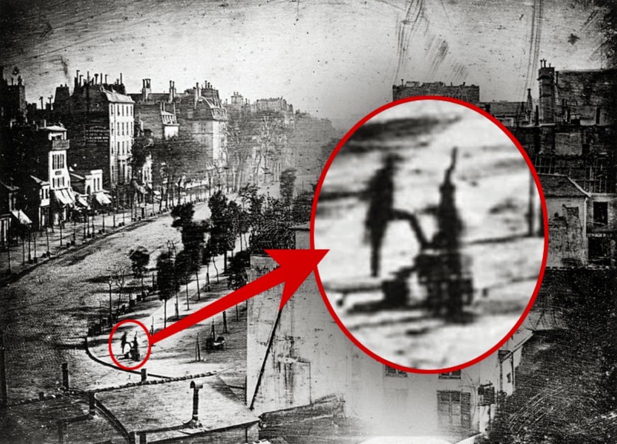 No canto inferior esquerdo, no entanto, um homem aparentemente a engraxar as suas botas bem como o engraxador, estavam imóveis o suficiente para as suas imagens ficarem gravadas.